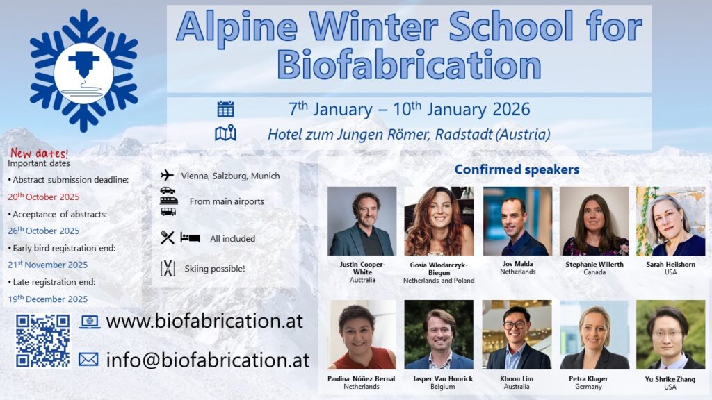 - Join the Winterschools on Biofabrication and Tissue Engineering in Radstadt!Next January, Radstadt in rural Salzburg will feature two Winterschools in close succession. The third edition of the Alpine Winterschool for Biofabrication will take place January 7 – 10. This… Read More »Join the Winterschools on Biofabrication and Tissue Engineering in Radstadt!